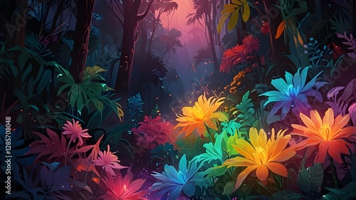 Wall mural a vibrant fantasy forest scene features an array of colorful flowers illuminated by soft, magical li - Wall murals Wall mural a vibrant fantasy forest scene features an array of colorful flowers illuminated by soft, magical li - Wall murals