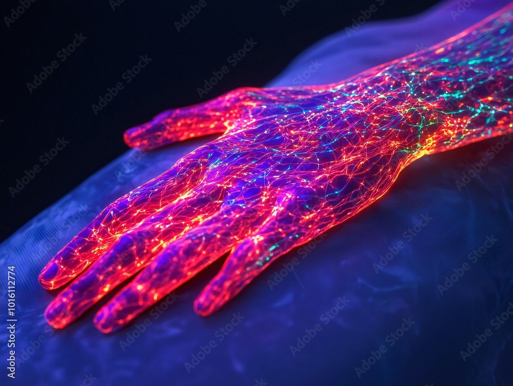 The watermark will not be included on Wall mural.: A vibrant hand illuminated with colorful light patterns, creating a mesmerizing visual effect on ski