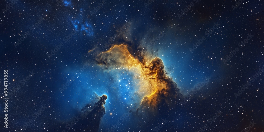 The watermark will not be included on Wall mural.: A vibrant nebula glows in the vastness of space, its colors of gold and blue creating a stunning cos