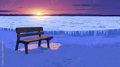 Wall mural : A view of a bench with a view of an ice sheet in the evening - 4k animated video