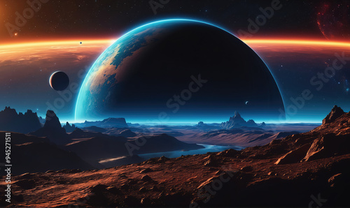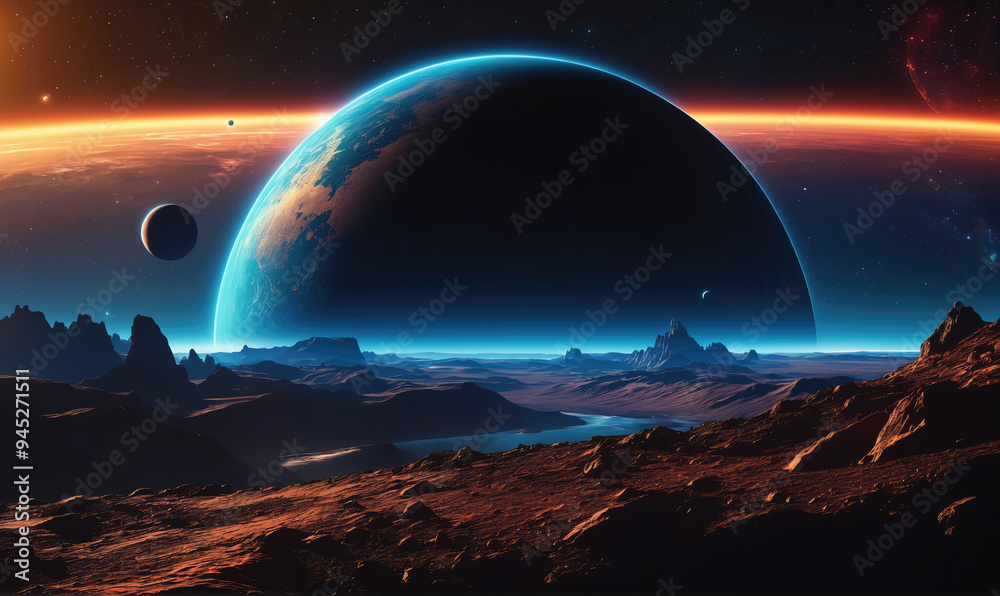 Wall mural a view of a distant planet with a blue atmosphere from the surface of another planet - Wall murals Wall mural a view of a distant planet with a blue atmosphere from the surface of another planet - Wall murals