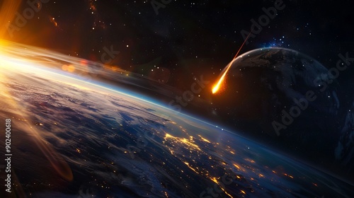 Wall mural : A view of the earth from space with a comet in the sky