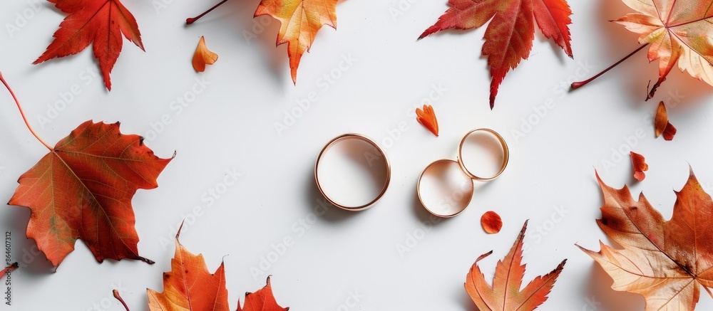 The watermark will not be included on Wall mural.: A visually striking composition with wedding rings and maple leaves on a white background creating a