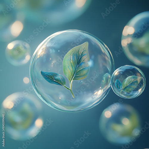 Wall mural a visually striking image of floating cells with green leaves inside, creating serene and tranquil a