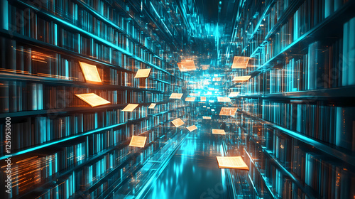 The watermark will not be included on Wall mural.: A visually stunning stock photo of a floating virtual library with infinite rows of books and glowin