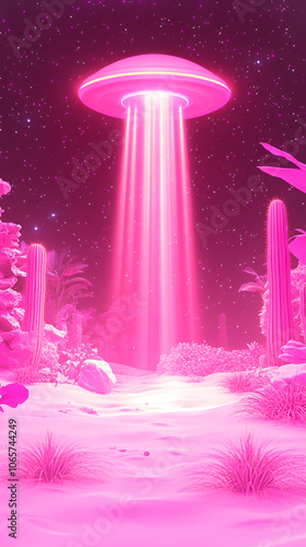 Wall mural a vivid representation of a ufo beaming light down in a surreal desert during a brightly colored nig