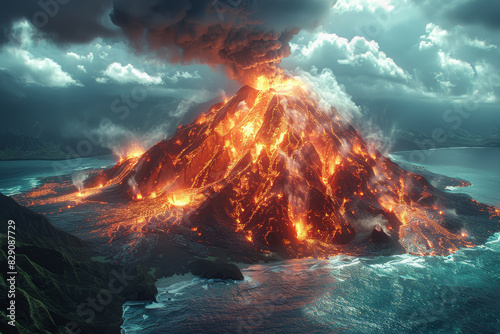 Wall mural : A volcano erupting and then calming into a peaceful island - concept of destruction and creation - gen