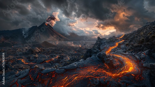 The watermark will not be included on Wall mural.: A volcano with a lava flow is shown in the distance