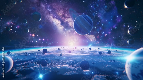 Wall mural a vr ride that takes passengers on a journey through outer space zooming past planets and stars.