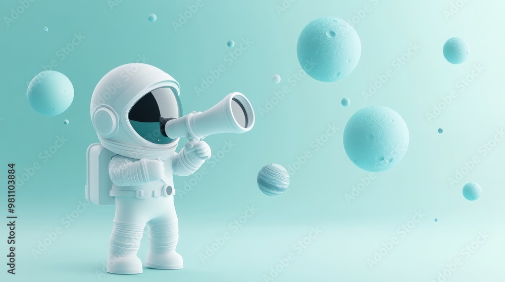 The watermark will not be included on Wall mural.: A whimsical astronaut character observing floating celestial bodies with a telescope -