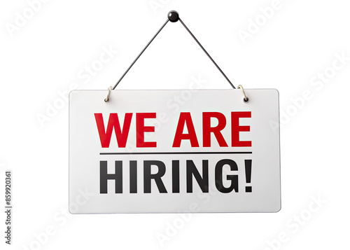 Wall mural a white sign with red and black text reading we are hiring! is hanging from black string against a w - Wall murals Wall mural a white sign with red and black text reading we are hiring! is hanging from black string against a w - Wall murals
