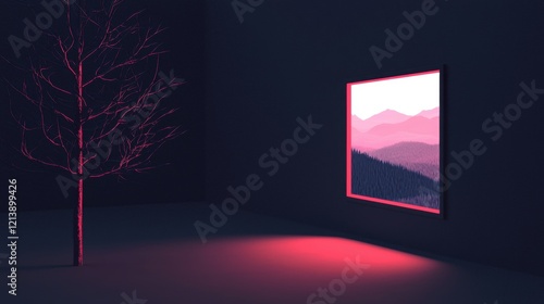 The watermark will not be included on Wall mural.: A window with a view of mountains and a tree in the foreground