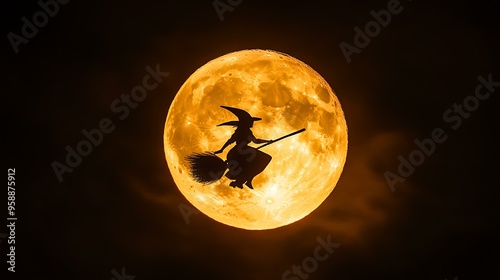 The watermark will not be included on Wall mural.: A witch flying on a broomstick silhouetted against a full moon