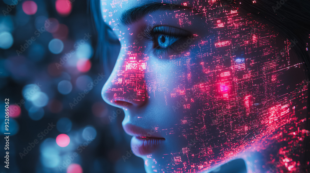 Wall mural : A woman's face is shown in a computer generated image with a blue eye and red lines - the image has a