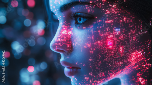 Wall mural a woman's face is shown in a computer generated image with a blue eye and red lines. the image has a