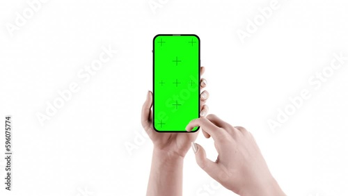 The watermark will not be included on Wall mural.: A woman's hand holds a smartphone with an empty screen - animation of scrolling through the content