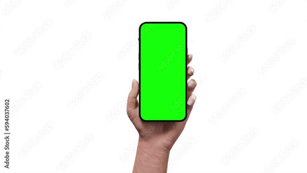 Wall mural : A woman is holding a smartphone with a blank screen in her hand, and the camera is smoothly rotating