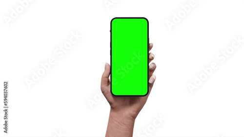 Wall mural a woman is holding a smartphone with a blank screen in her hand, and the camera is smoothly rotating