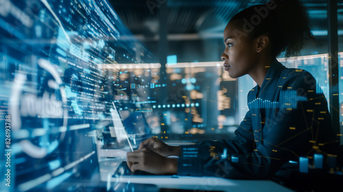 Wall mural a woman is sitting in front of a computer screen with a lot of numbers and graphs. she is typing on