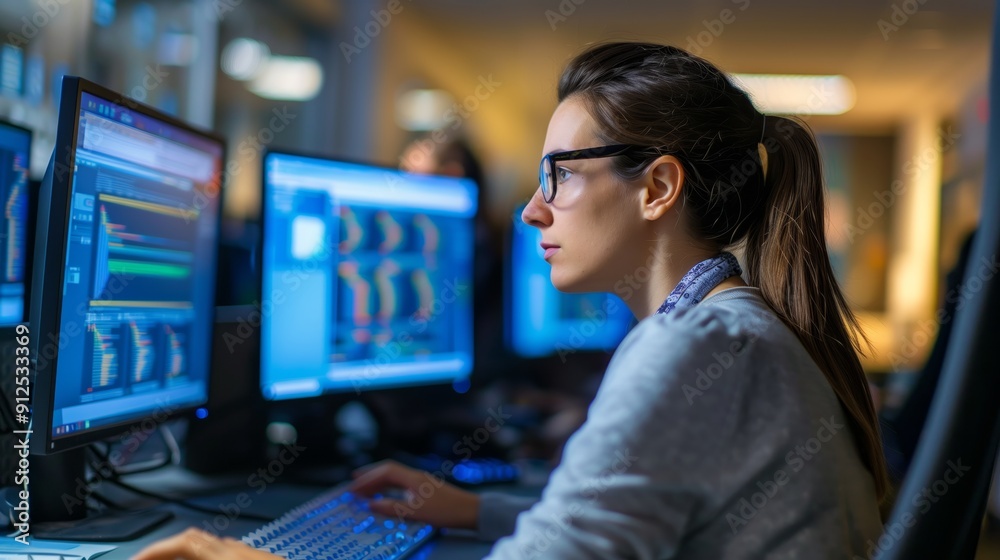 The watermark will not be included on Wall mural.: A woman works as an operator specialist in a computer data center in front of many monitors with cha