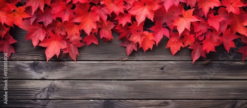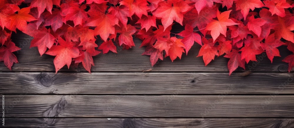 Wall mural a wooden background adorned with vibrant red autumn leaves provides a frame for text offering ample