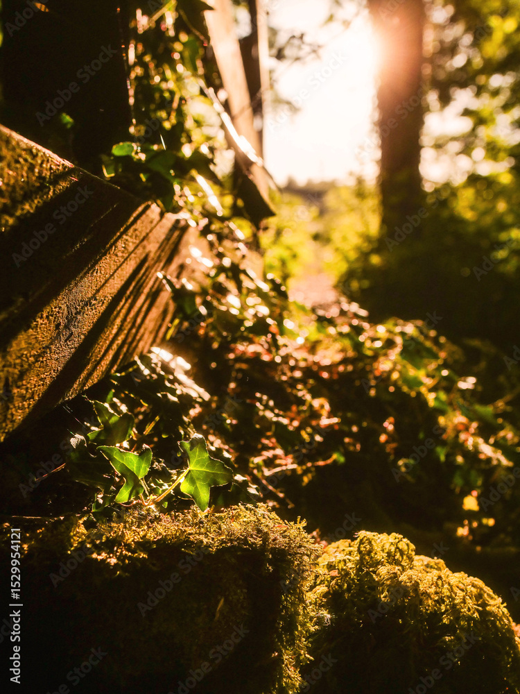 Wall mural a wooden fence with a path in between. the path is lined with trees and leaves. the sun is shining t - Wall murals Wall mural a wooden fence with a path in between. the path is lined with trees and leaves. the sun is shining t - Wall murals