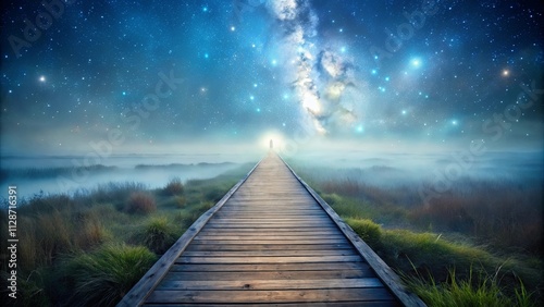 Wall mural a wooden path leading into the ethereal mist beneath a celestial tapestry of stars and a shimmering  - Wall murals Wall mural a wooden path leading into the ethereal mist beneath a celestial tapestry of stars and a shimmering - Wall murals