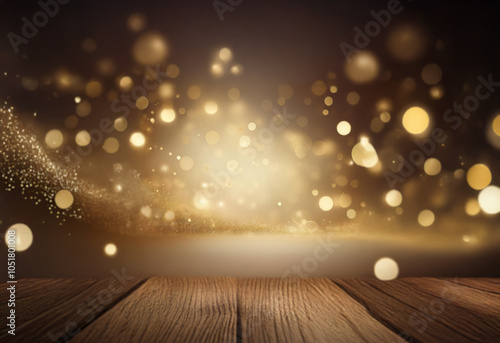 Wall mural a wooden platform sits in front of a dark background illuminated with soft golden light and bokeh. - Wall murals Wall mural a wooden platform sits in front of a dark background illuminated with soft golden light and bokeh. - Wall murals