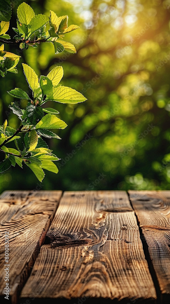 Wall mural a wooden table with a leafy branch on top of it. the branch is green and has a few leaves on it. the - Wall murals Wall mural a wooden table with a leafy branch on top of it. the branch is green and has a few leaves on it. the - Wall murals