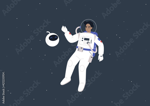Wall mural : A young male astronaut in a spacesuit and a cute round robot floating in outer space, a futuristic l