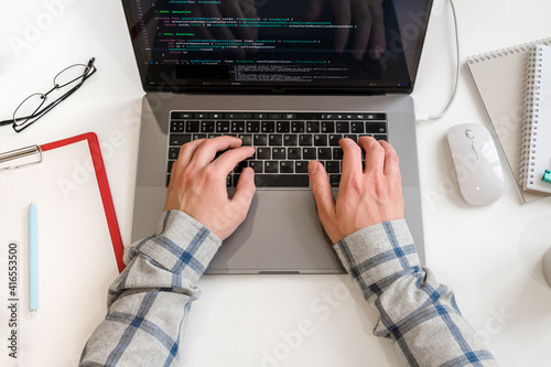 Wall mural : A young male programmer uses a laptop and types code in the office - software, programming concept