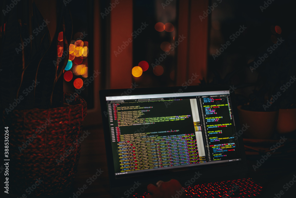 The watermark will not be included on Wall mural.: A young man programmer coding on a laptop in the dark with a view of the lights of the night city, c