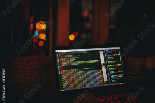 Wall mural a young man programmer coding on a laptop in the dark with a view of the lights of the night city, c - Wall murals Wall mural a young man programmer coding on a laptop in the dark with a view of the lights of the night city, c - Wall murals