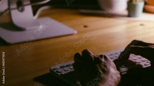 The watermark will not be included on Wall mural.: A young man programmer coding on a laptop in the dark with a view of the lights of the night city, c