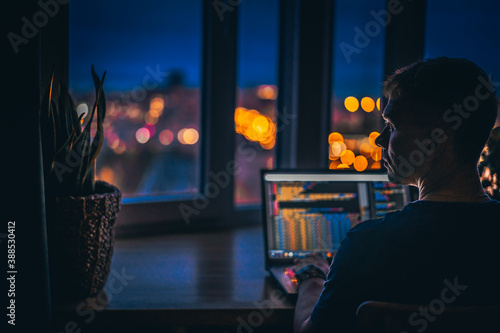 Wall mural a young man programmer coding on a laptop in the dark with a view of the lights of the night city, c - Wall murals Wall mural a young man programmer coding on a laptop in the dark with a view of the lights of the night city, c - Wall murals