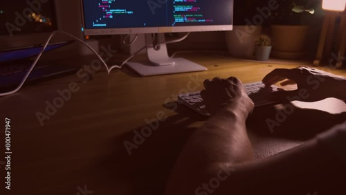The watermark will not be included on Wall mural.: A young man programmer coding on a laptop in the dark with a view of the lights of the night city, c