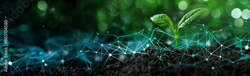 A young plant sprouting from the soil, surrounded by an array of digital connections and data points