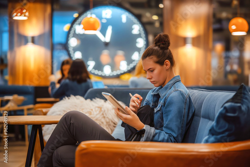 Wall mural : A young professional using a tablet with a project management app, seated in a co-working space with