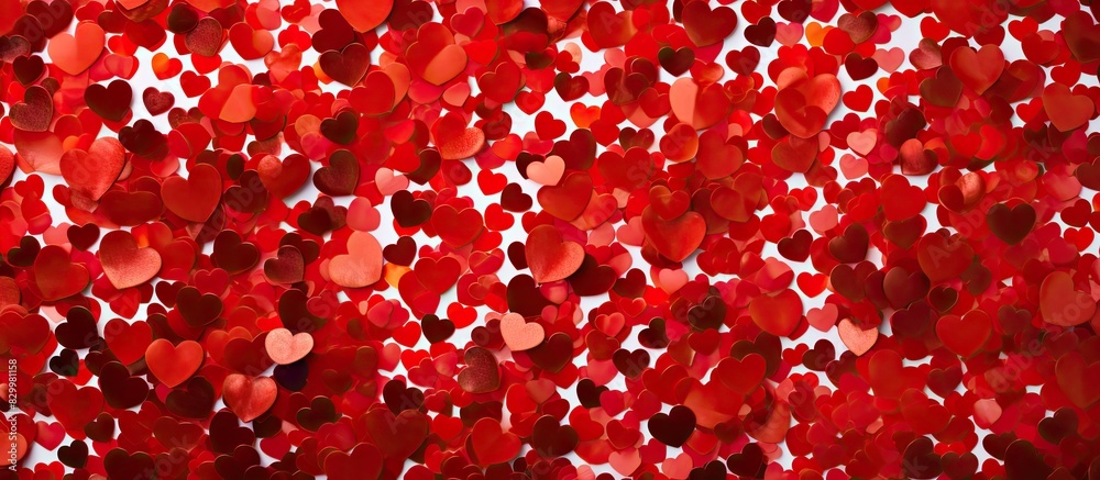 The watermark will not be included on Wall mural.: Above view of a flat lay containing a pattern of red confetti for valentine s day the image has copy