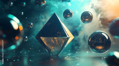 Wall mural abstract, futuristic background with a glowing pyramid and floating spheres.