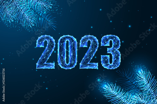 Wall mural : Abstract 2023 happy new year digital web banner with evergreen branches in futuristic style on blue