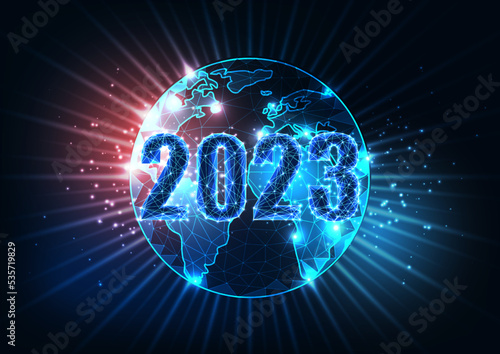 Wall mural : Abstract 2023 happy new year to the world concept banner with globe map in futuristic glowing style