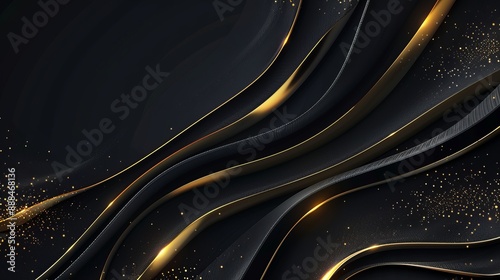 Wall mural abstract 3d black background with gold lines in curved wavy sparkle design featuring copy space for