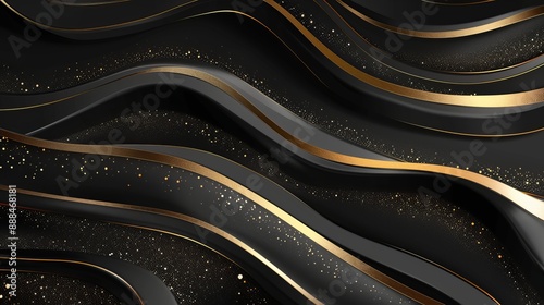 Wall mural abstract 3d black background with gold lines in curved wavy sparkle design featuring copy space for