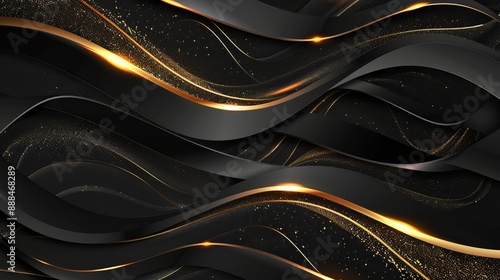 Wall mural abstract 3d black background with gold lines in curved wavy sparkle design featuring copy space for