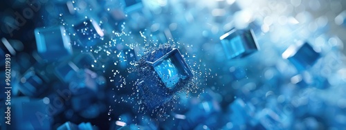 The watermark will not be included on Wall mural.: Abstract 3d featuring falling blue cubes with sparks sparkles horizontal view