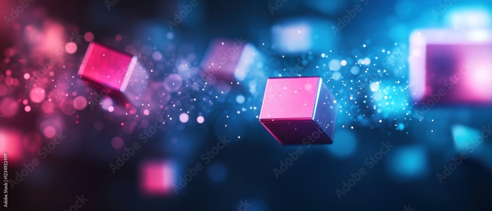 Wall mural abstract 3d pink and blue cubes floating with bokeh lights and particles in a dark background concep - Wall murals Wall mural abstract 3d pink and blue cubes floating with bokeh lights and particles in a dark background concep - Wall murals