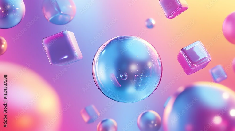 The watermark will not be included on Wall mural.: Abstract 3d rendering of glossy spheres and cubes floating against a colorful background -