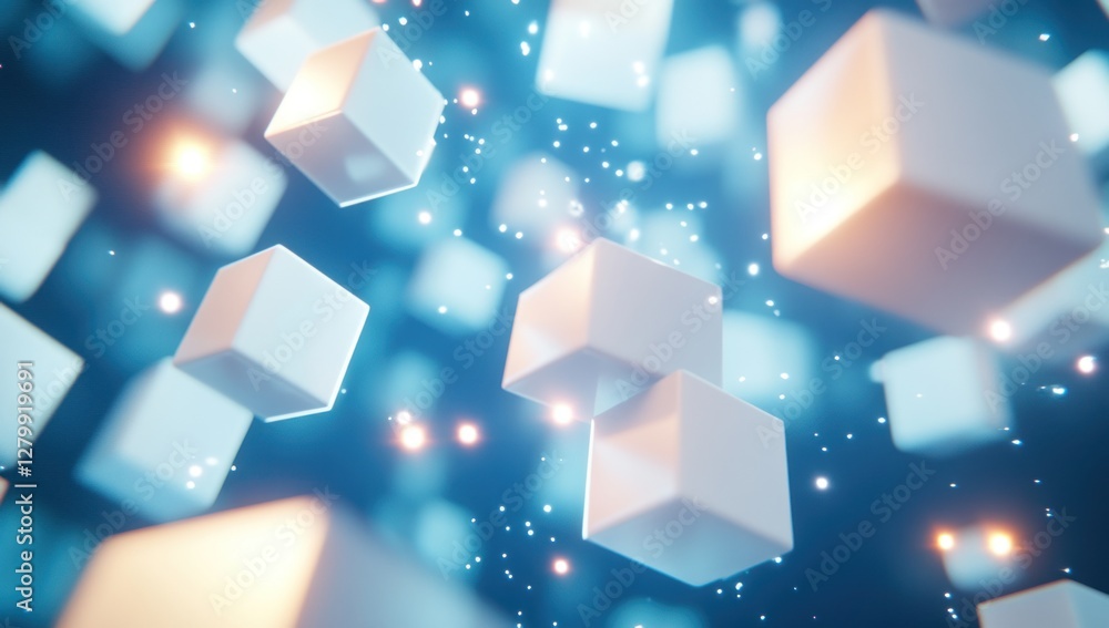 The watermark will not be included on Wall mural.: Abstract 3d rendering of glowing white cubes floating in a blue space -