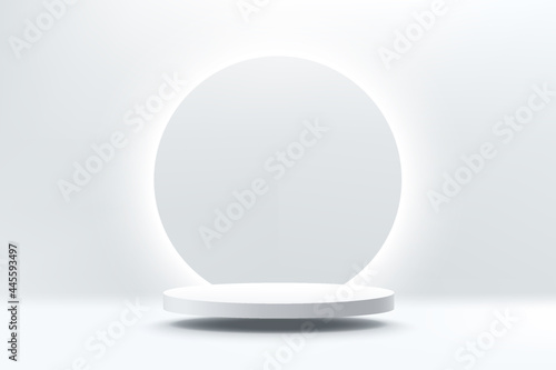 The watermark will not be included on Wall mural.: Abstract 3d silver cylinder pedestal podium floating on air with glowing neon ring background - silve